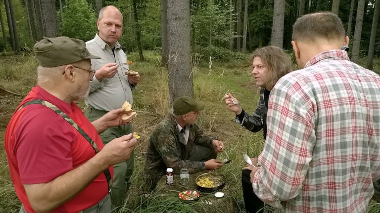 Na další den jsme předpokládali k vaření využít skutečnosti, že houbařská sezóna je v plném proudu. Plán byl nasbírat si cestou večeři. Ovšem, úplně jednoduché to nebylo. Houby v lese jsou totiž zadarmo, a tak národ v houfech vyráží do lesů již s rozbřeskem a drancuje a drancuje ve spolupachatelství. My však s rozbřeskem teprvá vaříme první ranní grog, pak druhý, pak klohníme snídaňku, a až pak vyrážíme. A to už v lese nezbývá ani prašivka. Já ovšem mám hezký zvyk v houbaření – když tu není ta houba, kterou bych sbírat chtěl, sbírám tu, která tu je. Musí se to ale dělat nenápadně a ulovené poklady se musí rychle na drobno pokrájet, neboť, pokud to nestihnu, zlý Novinář mi je vždycky vyhází. Považuje se totiž za vzdělanějšího mykologa nežli jsem já.